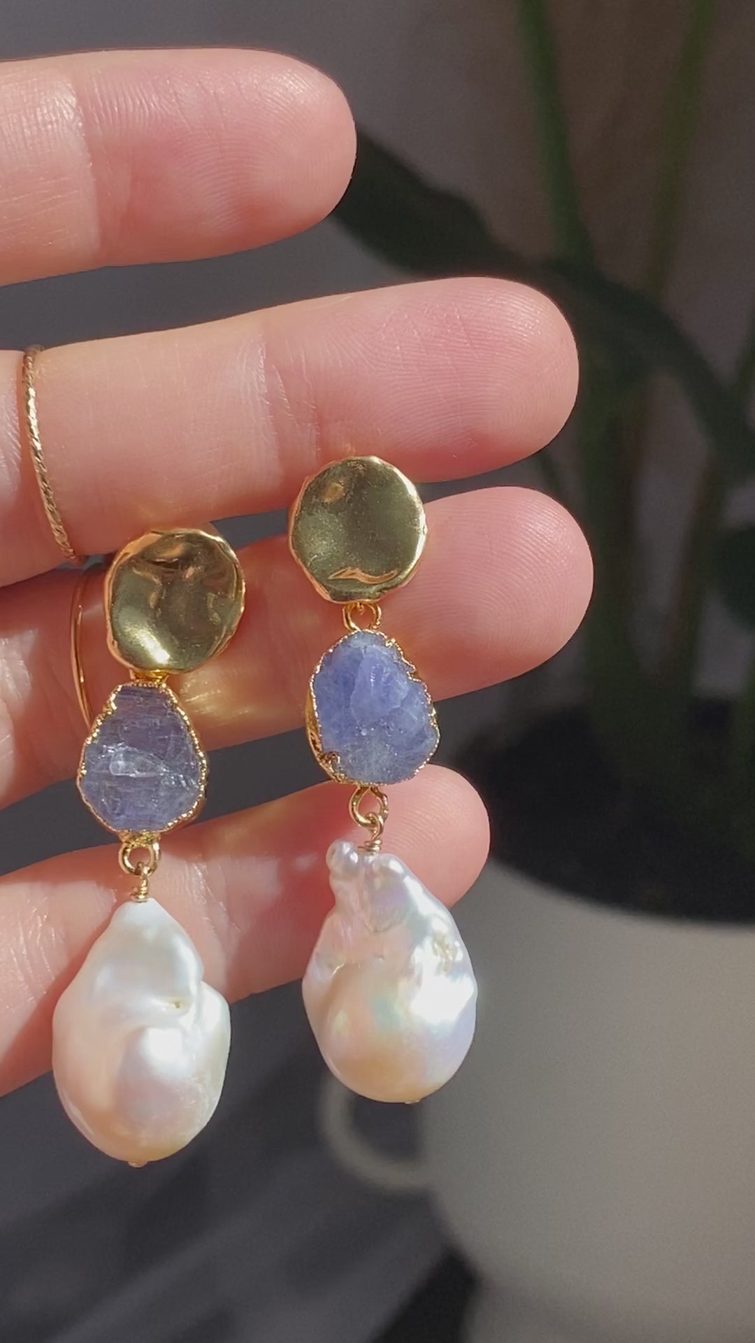 A highly personalised pair of earrings made with the highest quality, raw cut gemstones and beautifully natural baroque pearls. Each part is handcrafted in Japan, India, China and Australia to bring this vision to a sparkly reality.